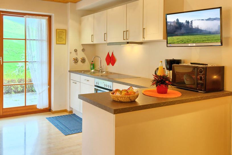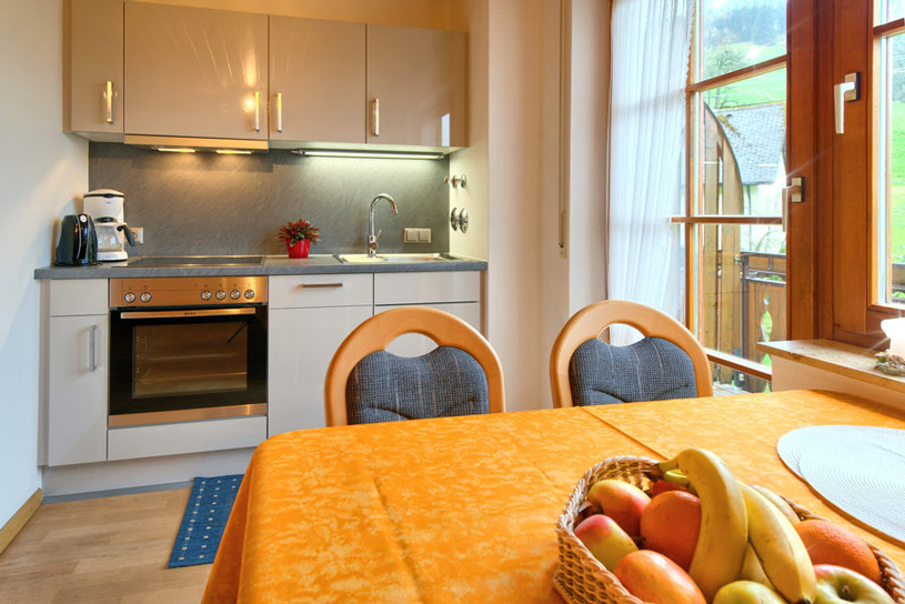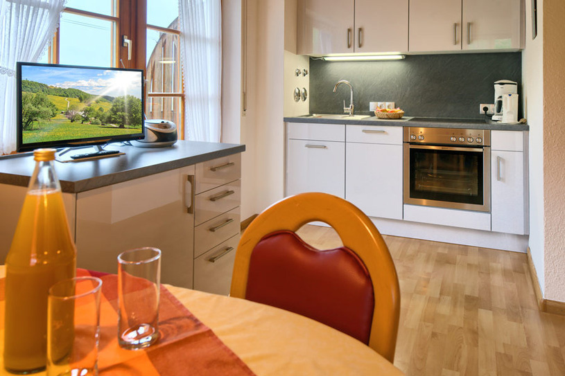 Im Inneren unseres Ferienhauses befinden sich 4 wunderschöne, komfortabel ausgestattete Ferienwohnungen. Morgens sorgt der Ausblick ins Grüne für einen guten Start in den Tag und Abends sitzt man gerne bei einem Schnaps aus der hauseigenen Brennerei zusammen.