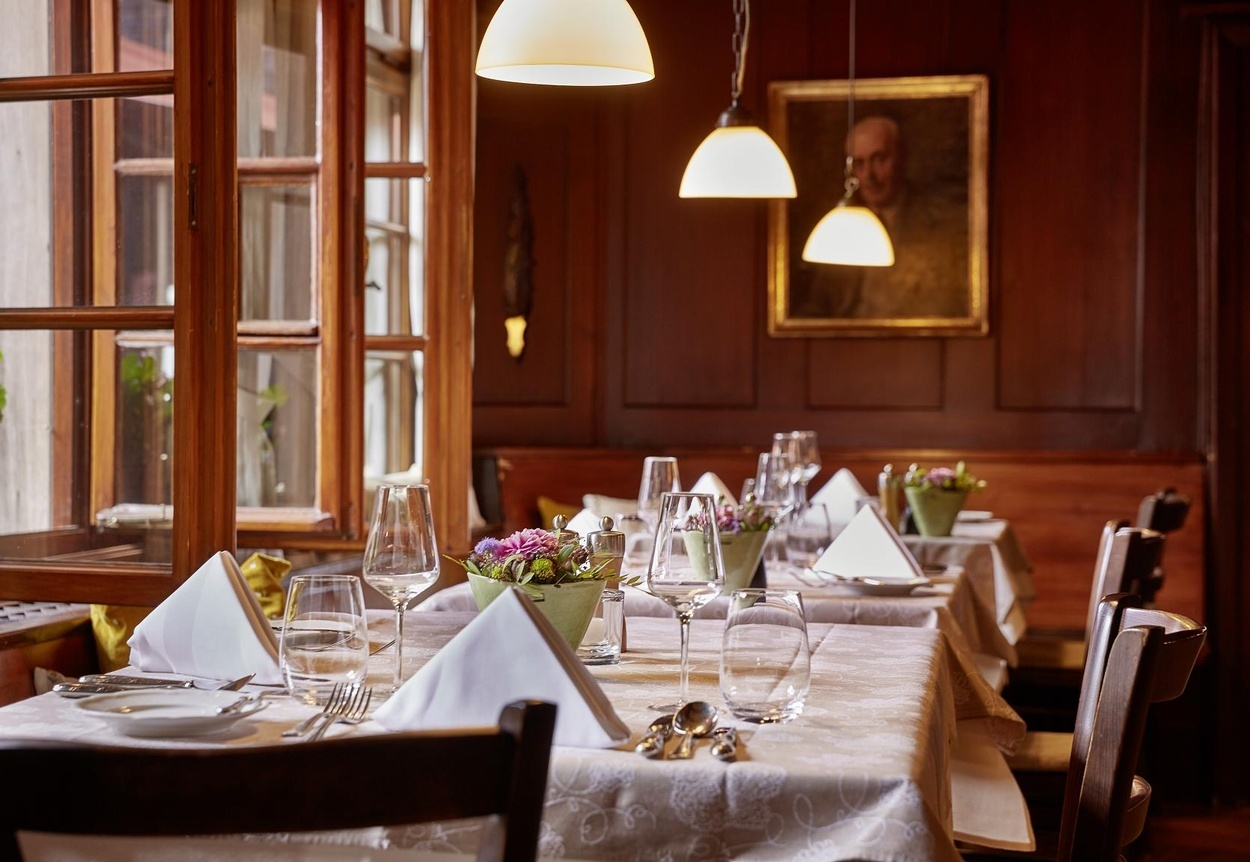 unseren Gaststuben | Nehmen Sie unser Viergang-Abendmenü nicht in Anspruch, schreiben wir Ihnen pro Person/Abend 15,– Euro auf der Zimmerrechnung gut | Grander-Quellwasser steht im ganzen Haus zur Verfügung.