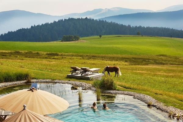 ins Panorama. Ob zu zweit oder für ihre private Feier. Die familiäre und ehrliche Gastfreundschaft ist überall spürbar. Das Badehaus (1.100 m2) zeigt drinnen wie draußen seine Vielfalt: Von Massagen bis Kosmetik. Von Saunen bis Naturbadeteich. Das betreute Aktivprogramm ergänzt täglich wechselnd: Yoga, Chi, Nordic Walking, Wandern oder Schneeschuhtouren. E-Bikes und Mountainbikes stehen zum Verleih.